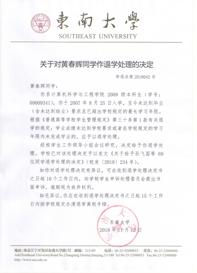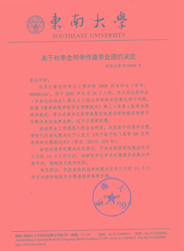 经校学生工作领导小组会议研究,决定给予计算机学院2008级本科生李念(学号:09008140)、2009级本科生黄春辉(学号:09009341)等两位学生退学处理。学校已对该处理决定予以发文《关于给予孙飞国等69为同学退学处理的决定》(校发(2018)234号)。