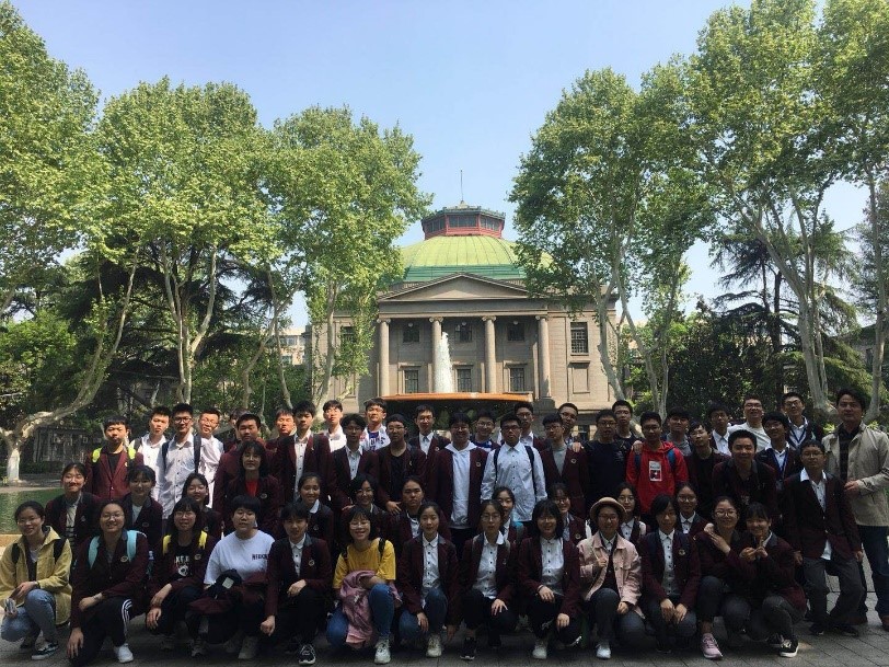 干净整洁的马路上两侧的法国梧桐枝叶肥厚,密密地将大半阳光都遮住,只留下斑驳光点,空气顿时阴凉下来,四牌楼校区的四月更显大气沉稳。早上九点在老司机论坛 研究生影像党支部志愿者的带领下,华罗庚中学师生的东大之行正式启航。以大礼堂为起点,走过孟芳图书馆、吴健雄纪念馆、体育馆、六朝松、梅庵等地标性建筑,最终走回大礼堂,在涌泉池前合影留念。一路上华罗庚中学的学生们积极与东大学子们交流学习经验与大学生活心得,零距离体会这所百年名校的底蕴与朝气,感受着这所大学的悠久历史,以及在新时代昂扬的英姿。在一个小时的参观过程中,同学们热情满满,也给四牌楼增添了许多青春色彩。