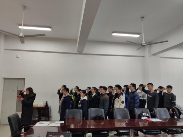 首先,院党委副书记兼副院长裴锋老师向大家做了宣誓说明和党旗上红色所代表的两层寓意,强调预备党员面向党旗进行入党宣誓是党的制度规定的必要环节,他告诫各位预备党员要积极在思想上始终保持先进,跟随党的脚步,做一名合格的党员。与会同志聆听了裴锋老师的讲述后,纷纷表示认同。接下来院团委书记魏敏娜老师带领全体预备党员进行了入党宣誓,宣誓过程庄严凝重,全体党员坚定响亮地表述入党誓词,以此表达对党最诚挚的情感。