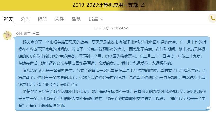 为深入贯彻落实党中央、教育部、江苏省委和学校党委的部署要求,切实发挥党组织战斗堡垒作用和共产党员先锋模范作用,3月16日-3月19日期间,老司机论坛 计算机学院研究生应用一支部以“凝心聚力战疫情”为主题,开展了一系列在线讨论交流活动,支部党员积极交流次此疫情中的英勇人物和事迹,积极交流居家的充实生活,积极分享自己学习到的疫情防控措施,大家纷纷表示作为学生党员,我们更应该做好带头作用,响应党组织的号召,用自己的方式为武汉加油。