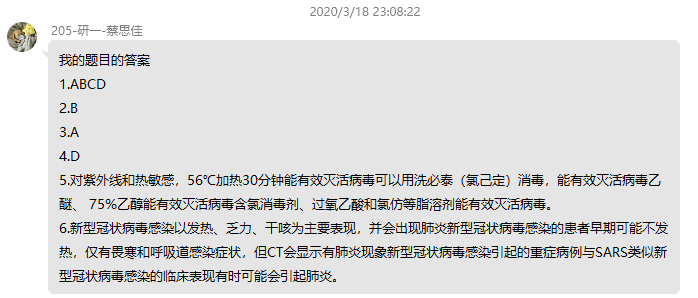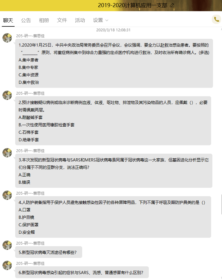 第三天,举办知识问答与科普活动,组织支部成员收集疫情相关的知识,并形成问答题或者选择题发送至支部群里,供大家思考与讨论。