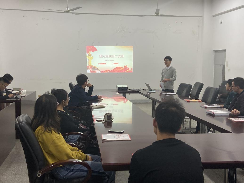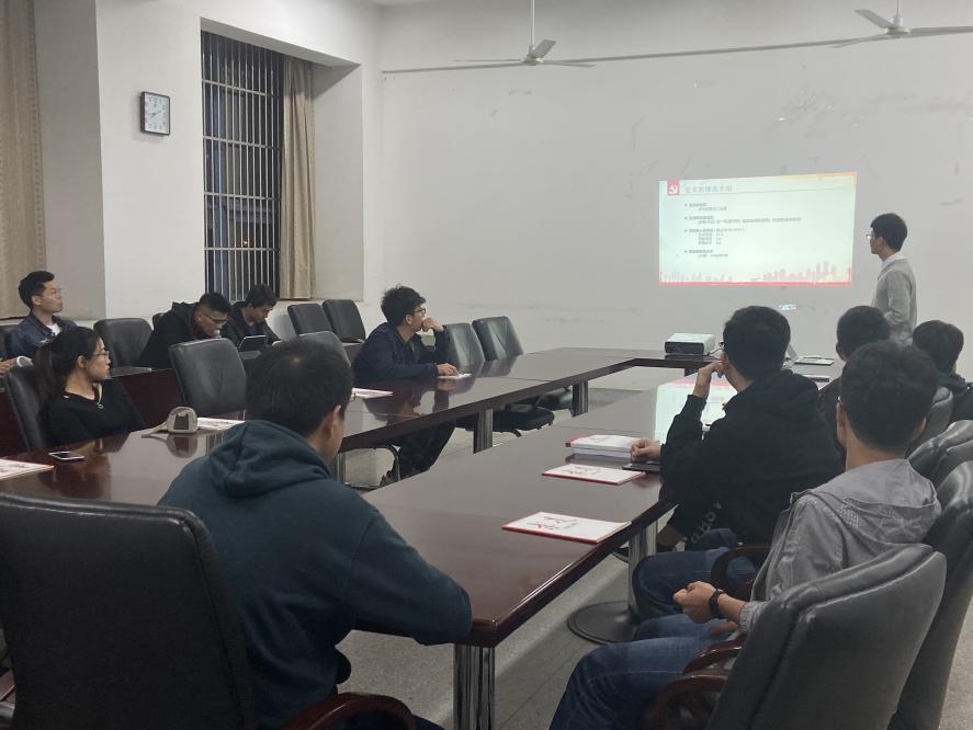 首先介绍了研究生联合二支部的基本情况,截止2019年10月31日,支部共有中共党员28人,其中正式党员21人,预备党员2人,积极分子5人。赵满同志担任支部书记,杜一鸣同志担任支部副书记,陆志成同志担任组织委员,刘玉章同志担任宣传委员。同时本支部也根据导师和实验室划分了4个党小组,进行科学管理。并且成立了QQ群,方便同志们线上交流学习,分享学习心得。党支部书记赵满同志也对党支部的事务做了介绍,主要包括“三会一课”制度和定期组织大家一起学习的活动。