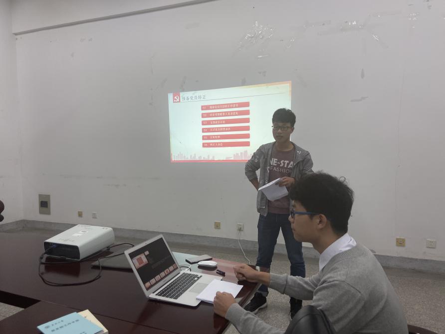 会议的第二个内容是进行预备党员转正。本次刘欢同志经过了一年的考察,预备期满,党支部通过开会的讨论其转正资格。首先请这位预备党员上台宣读转正申请书,然后通过培养联系人发表意见、支部成员讨论。大家一致认为该同志已基本符合一名正式党员的要求,并进行了举手表决。投票结果显示,党支部同意刘欢同志转为正式党员。最后,新进党员同志表明了自己的态度,今后也会一直以一名合格党员的标准严格要求自己。