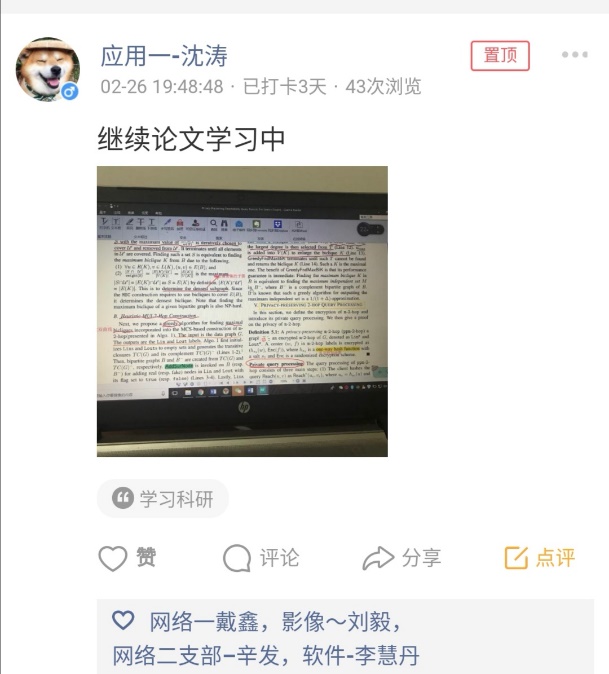 计算机学院研究生各党支部于2月24日发起了“SEU计算机学院研究生党日活动”线上打卡活动,以倡导广大研究生党员同学居家进行学习科研等活动,养成良好的生活习惯,分享每日生活中的小快乐。