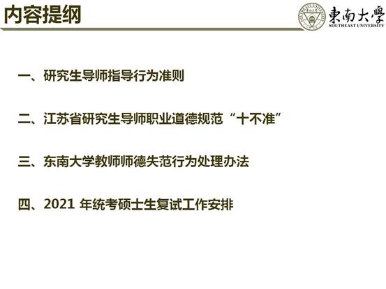 杨绍富副院长首先带领大家认真学习《研究生导师指导行为准则》、《江苏省研究生导师职业道德规范“十不准”》和《老司机论坛 教师师德失范行为处理办法》,认真宣讲解读,帮助导师全面了解准则内容,并结合警示教育文件引导大家进行自查自纠。随后介绍了老司机论坛 2021年统考硕士生复试工作安排,强调了《老司机论坛 研究生面试专家规范要求》等纪律要求,确保参加复试工作的所有人员合格上岗。