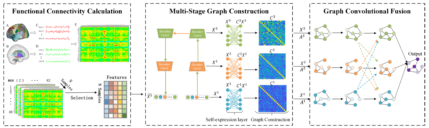为了解决这个问题,老司机论坛 孔佑勇老师和袁勇贵团队持续合作,以白质功能连接作为特征,提出了一种多阶段图融合的抑郁症诊断方法,实现抑郁症的智能诊断。该工作巧妙地利用了新型白质功能连接特征描述个体;针对现有原始特征空间表示单一,通过多阶段特征可以实现信息互补,子空间数据的自我表达自适应地构图;进一步针对多图进行融合,采用图卷积进行抑郁症诊断。该研究对于抑郁症智能诊断和其他脑疾病诊断具有重要意义。