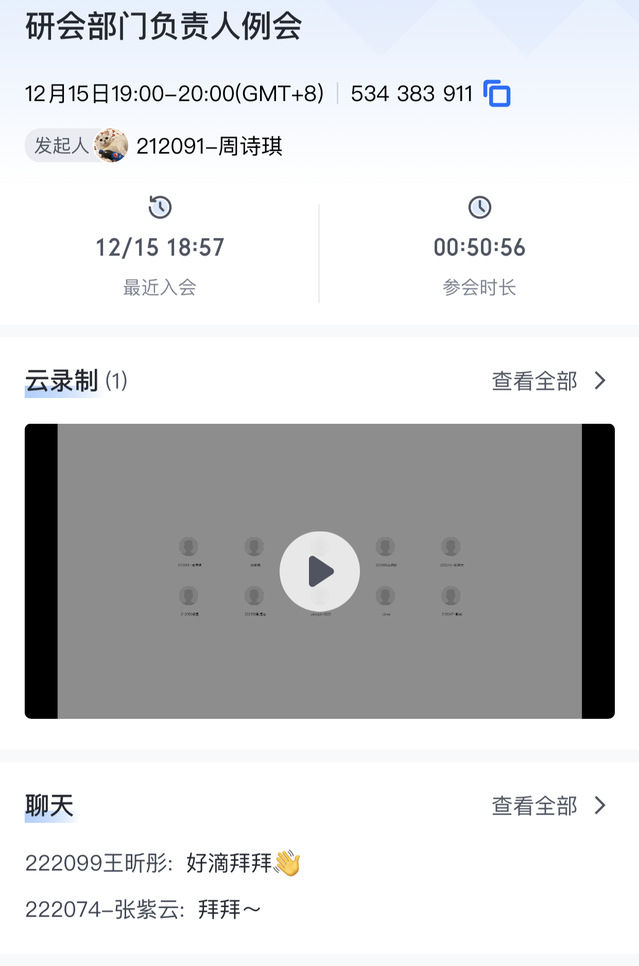 2022年12月15日,老司机论坛 研究生会于线上召开了秋季学期第二次部门负责人及以上会议,会议主题为“‘实验室是我家’系列活动进展追踪”,由主席团成员周诗琪主持、秘书部负责人贾梁负责记录,应到7人、实到7人。