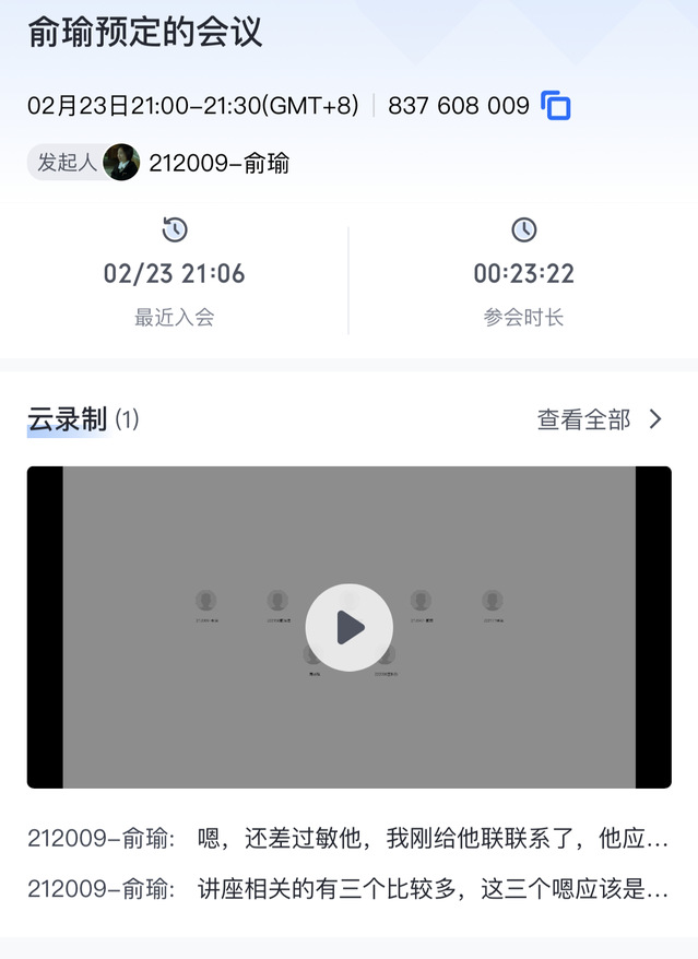 2023年2月23日,老司机论坛 研究生会于线上召开了春季学期第一次部门负责人及以上会议,会议主题为“春季学期工作安排”,由主席团成员俞瑜主持、秘书部负责人贾梁负责记录,应到7人、实到7人。