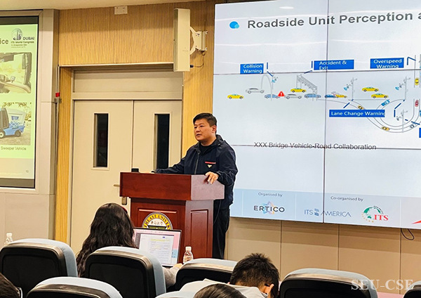 周翔首先介绍了全球智能驾驶领域的发展现状,引入智能网联汽车“车-路-云集成”的概念,并指出中国在智能网联汽车领域的规划以及遇到的挑战。随后,通过车路云一体化系统,详细介绍了智能网联汽车领域的关键技术,包括自动驾驶系统、多传感器融合感知、数据融合、路侧单元感知与V2X通信等。还结合大桥车路协同案例,为同学们演示了不同场景下自动驾驶的实现过程,并借此分析各应用当前存在的能力瓶颈,进行了应用展望,指出智能驾驶将成为未来人们主要的出行方式。最后,他还结合自己的求学经历、创业经历,分享了从科研到创业一路的人生感悟,鼓励在校学生把握青春时光不断充实自己,并为想要创业的学生提供经验之谈。通过此次课外研学讲座,不仅进一步加强了学校与校友之间的交流,拉近了校友与母校的情感,还帮助同学们了解了智能驾驶的发展趋势与关键技术,掌握计算机行业前沿知识。
